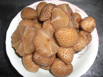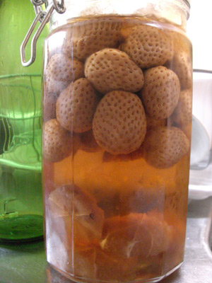 2008年1月に漬けたイチゴ酒です。 これをワインの入っていたビンに入れ替えます。 取り出した果肉は全部変な色… でも香りはイチゴとアルコールのいい香り~ ![]() 後でジャム作りに使えるかもという希望の元、冷凍保存しておくことにしました。 漏斗を使って移しました。 色は楽しめませんが、飲みやすくなりました ![]() |