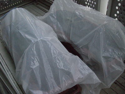 だから防寒対策してます。 ちなみにうちのやりかたは適当 です。地味に針金を切ります。 長さは大まかです。 別に夜なべはしてません。 針金をドーム型にさして、その上からビニール(70Lゴミ袋)をかぶせて、下のほうをガムテープで留めて。 それっぽい感じになってます。 まだ寒さは続くっぽいので、このまま引きこもっててもらいますよ~ ![]() PR |