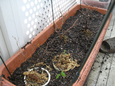 ほうれん草が植わっていたプランターに、小鉢の盆栽を埋めます。