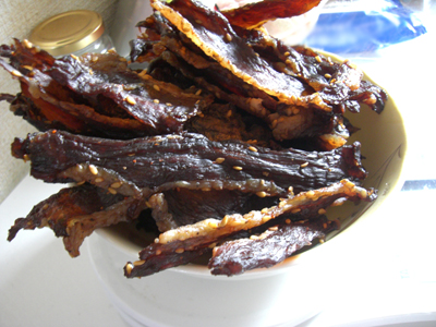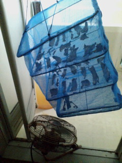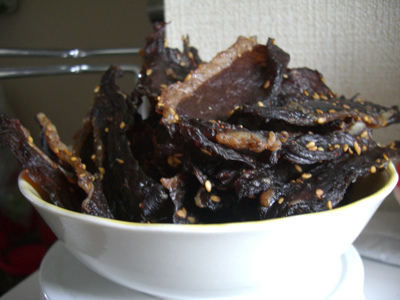 前回肉を干した6月4日の夕方に雨が降ると予報があったので、夕方には室内に取り込みました。 この時点で表面は結構乾いていましたが、まだ押すとやわらかめ。 でも早くジャーキー出来て欲しいので… お風呂場の換気扇を回しながら肉に扇風機で風を当てる作戦で。 これを一晩放っておいて、次の日(5日)に見たところ… ばっちりカッチカチ!!! この一晩で完成してしまいました。 しばらく干し網に入れたまま室内に置いて、ちょっとつまみ食いしました。 美味しいです ![]() そして、重さを計ってみると200gありました。 (※つまみ食いした分を入れたらもう少し) 写真だとそんな多くない感じですが、結構な量があります。 ちょっと脂身が残ってるところはブニブニして気持ち悪い…。 食べた時も脂身が美味しくないので、食べる際に脂身を取り除いてます。 作る前に取っておけばよかったと後悔。 それにしても、こんな簡単にジャーキーが作れるとは思っていなかったので驚きですよ! しかも美味しい ![]() 今回作ったものが無くなったらまた作りますよ ![]() |
