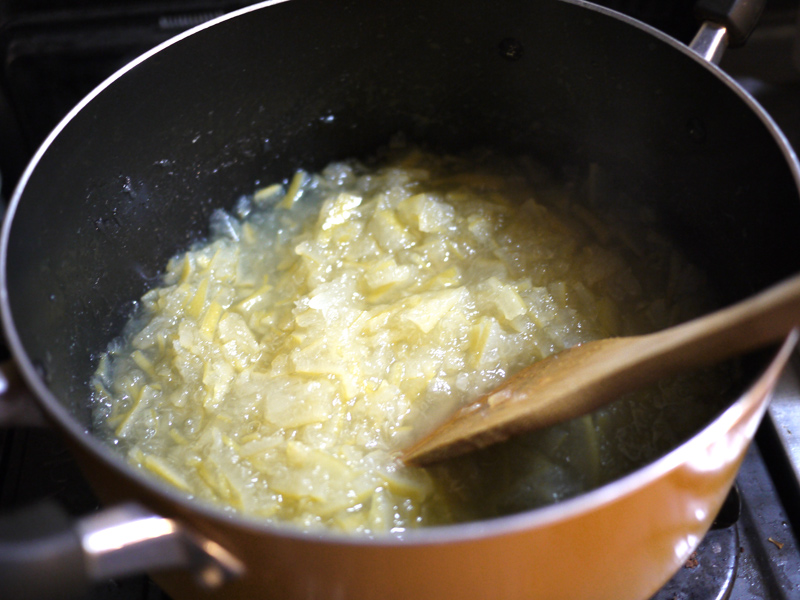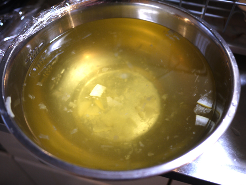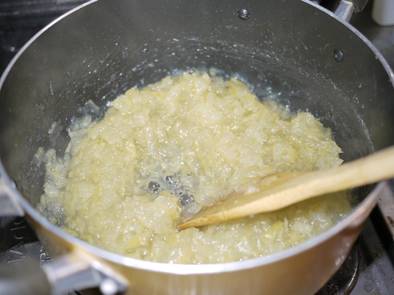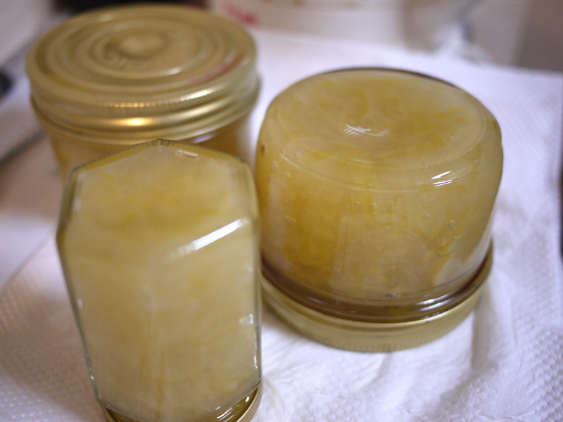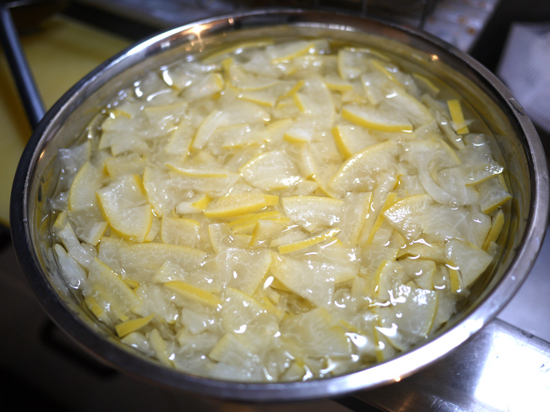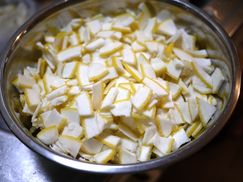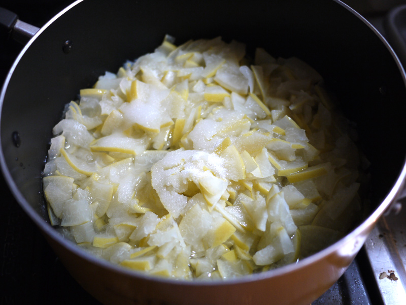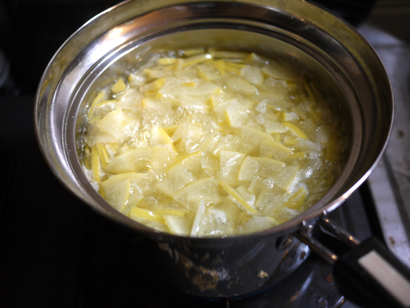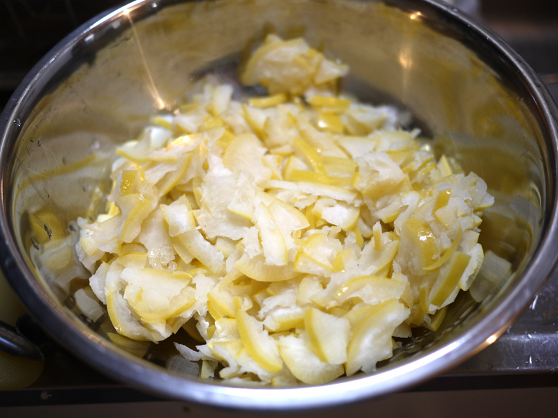用意するのは文旦の皮2個分。 それから、皮の重さの半分くらいの量のグラニュー糖。 ちなみに右の写真は文旦の中身。 そのまま美味しく頂きました ![]() 文旦の皮を細かく切りましたー。 白いふわふわの部分がとろみになるらしいので、ここも一緒に。 沸騰したお湯に皮を入れて10分くらい煮ます ![]() ザルに出して水で流したら手で絞って、今度は水を入れたボウルに投入。 水につけたまま一晩以上置いて、苦味を出してしまう!! 一晩明けて、また水気を絞るー ![]() 右の写真は文旦を浸けていた水 ![]() よく絞った皮に、ひたるくらいの水と砂糖を入れて煮詰めていきます。 とろとろのジャムになりましたー ![]() 煮沸消毒をしておいたビンいっぱいにジャムを入れて、逆さまにして冷ますと空気が入らないらしい ![]() 実際、まったく空気が入らずに長持ちしました。 ジャムは少し苦味があるけど、食べやすくて美味しかったです ![]() |