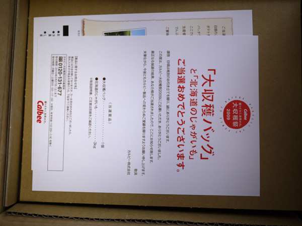 カルビー大収穫祭2009 友達の3倍は応募してたのに…と思っていたら。 きました。 やったー!! 横の穴からジャガイモが見えた!! 早速開けてみると、おめでとう的な紙とエコバッグ!! エコバッグは今回3種類あったんですが、一番可愛くて一番使えない黄色でした ![]() 一個でも当たって良かった…。 嬉しい~ ![]() 公式サイトを見てみると、どうやら当選人数を12000人分、急遽増やしたらしいですぞ ![]() その再抽選に当たったのかな。 |